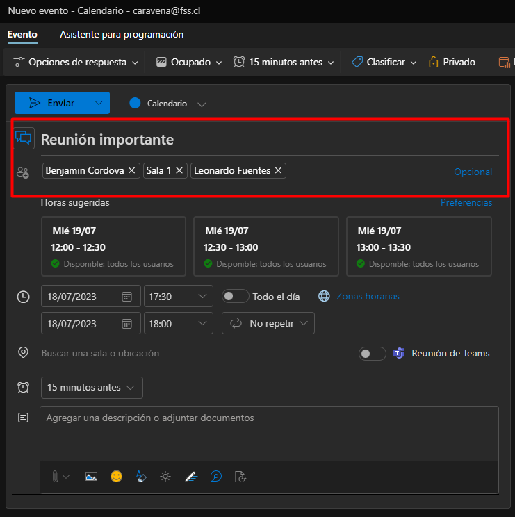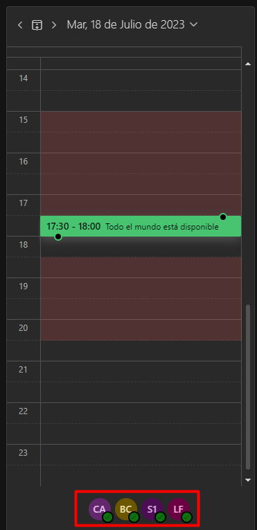 5. Al seleccionar a los participantes y la sala, automáticamente se mostrarán un horario sugerido donde estan todos disponibles, tanto las personas como la sala seleccionada.
