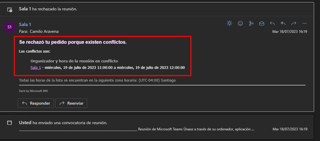 IMPORTANTE: Si la sala estará ocupada en el horario seleccionado al momento de enviar la reunión, llegará un correo automático de respuesta, avisando de que la reunión se rechazo por no contar con dispónibilidad horaria en sala.